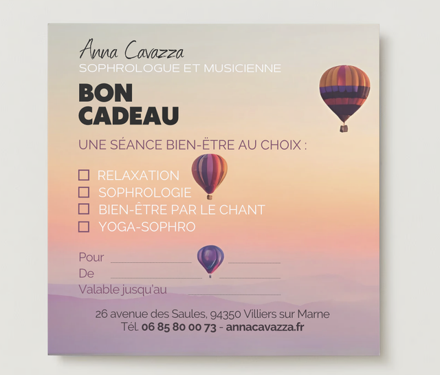 Offrez une heure de relaxation et détente personnalisée : ma formation me permet de décliner la sophrologie sous plusieurs formes (toutes fidèles aux principes et aux techniques de la sophrologie phénoménologique). La sophrologie peut être MEDITATIVE, LUDIQUE ou DYNAMIQUE, elle peut également être pratiquée EN MUSIQUE (SophroMusique et bien-être par le chant) ou EN MOUVEMENT (YogaSophro). Je peux ainsi accueillir chaque personne avec son unicité et aller à sa rencontre selon ses besoins.